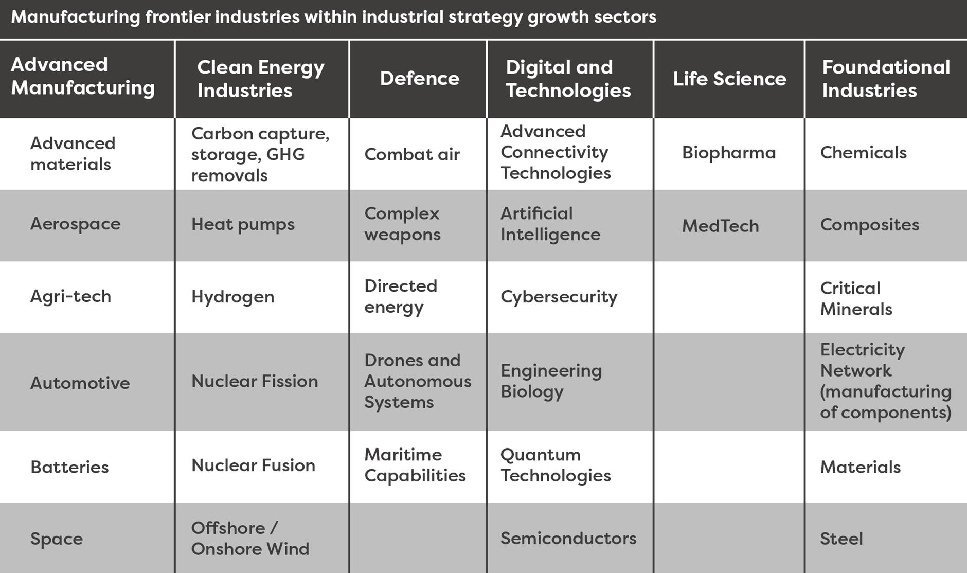 BICS is intended to support manufacturing frontier and foundational manufacturing that were identified in the Industrial Strategy as ‘growth sectors’ and known as the IS-8. These industries are defined by SIC & HS codes. The below table is an indicative example of what industries could be included and could be subject to change.