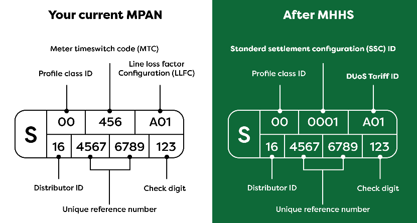 Another important change is that the top-line of a meter-point administration number (MPAN) is changing, meaning that your MPAN numbers will be updated. The graphic below shows the difference in your MPAN pre and post MHHS: