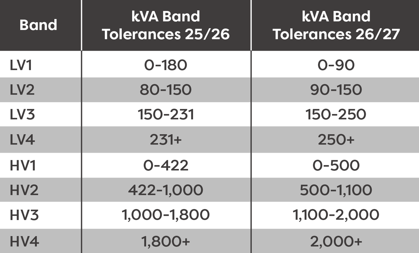 It is for this reason that is essential for a business to ensure that your kVA capacity is not higher than necessary and subsequently avoid being placed in a higher band and paying more costs than you should be. The below table highlights the full list of banding changes: